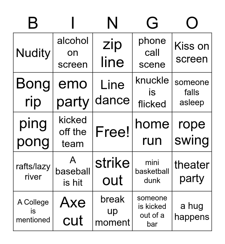 This bingo card has a free space and 24 words: A baseball is hit, Axe cut, Line dance, A College is mentioned, Kiss on screen, Nudity, Bong rip, alcohol on screen, home run, strike out, knuckle is flicked, ping pong, mini basketball dunk, theater party, emo party, someone is kicked out of a bar, rope swing, zip line, someone falls asleep, kicked off the team, a hug happens, rafts/lazy river, phone call scene and break up moment.