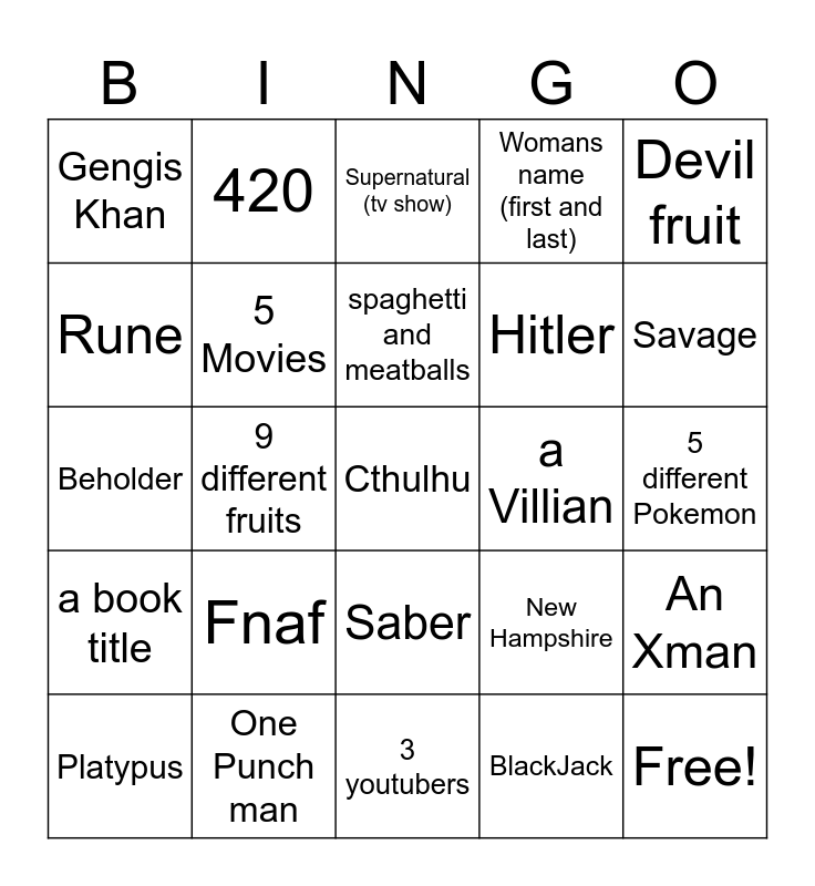 This bingo card has a free space and 24 words: Fnaf, One Punch man, spaghetti and meatballs, Platypus, Devil fruit, Gengis Khan, Rune, 420, a Villian, Saber, Hitler, Beholder, New Hampshire, An Xman, 5 Movies, BlackJack, 5 different Pokemon, Supernatural (tv show), Savage, 9 different fruits, Free!, a book title, Womans name (first and last) and 3 youtubers.
