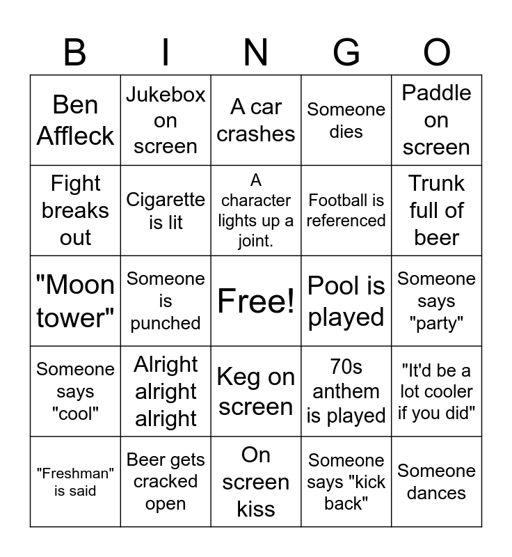 This bingo card has a free space and 24 words: Alright alright alright, Beer gets cracked open, A character lights up a joint., "Freshman" is said, Paddle on screen, Ben Affleck, Fight breaks out, Jukebox on screen, Pool is played, Keg on screen, Football is referenced, "Moon tower", 70s anthem is played, "It'd be a lot cooler if you did", Cigarette is lit, Someone says "kick back", Someone says "party", A car crashes, Trunk full of beer, Someone is punched, Someone dances, Someone says "cool", Someone dies and On screen kiss.