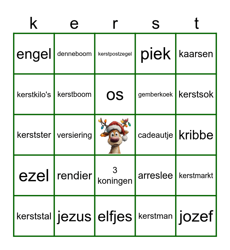 This bingo card has a free space and 43 words: misletoe, versiering, kerstmis, kerstman, kerstbal, kerststal, kerstboom, lichtjes, piek, kerstdiner, engel, rendier, arreslee, kerstmarkt, kerstklokjes, hulstblaadjes, kerstkrans, cadeautje, kerstkaart, kerstster, denneboom, slingers, kerststukje, kaarsen, advent, jezus, 3 koningen, maria, jozef, ezel, kameel, os, schaapsherder, kribbe, 3 wijzen, zuurstok, elfjes, gemberkoek, kerstsok, kerstkilo's, kerstshow, kerstpostzegel and musketkransjes.