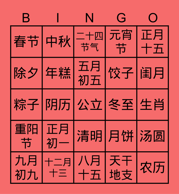 This bingo card has 25 words: 正月初一, 八月十五, 五月初五, 九月初九, 正月十五, 春节, 除夕, 中秋, 冬至, 清明, 饺子, 粽子, 月饼, 汤圆, 年糕, 农历, 生肖, 二十四节气, 闺月, 阴历, 公立, 十二月十三, 重阳节, 元宵节 and 天干地支.