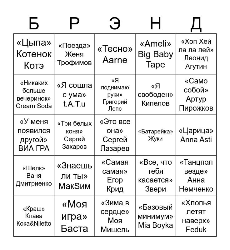This bingo card has 35 words: «Танцы» Андрей Губин, «Новогодняя» Дискотека Авария, «Я эту жизнь тебе отдам» Филипп Киркоров, «Я сошла с ума» t.A.T.u, «Самая самая» Егор Крид, «Ameli» Big Baby Tape, «Никаких больше вечеринок» Cream Soda, «Зачем» 5sta Family, «Я поднимаю руки» Григорий Лепс, «Красиво» Валерий Меладзе, «У меня появился другой» ВИА ГРА, «Хоп Хей ла ла лей» Леонид Агутин, «Кукла колдуна» Король и Шут, «Нон стоп» Пошлая Молли, «Цыпа» Котенок Котэ, «Батарейка» Жуки, «Базовый минимум» Mia Boyka, «Три белых коня» Сергей Захаров, «Шелк» Ваня Дмитриенко, «Это все она» Сергей Лазарев, «Все, что тебя касается» Звери, «Краш» Клава Кока&Niletto, «Танцпол везде» Анна Немченко, «Моя игра» Баста, «Тесно» Aarne, «Само собой» Артур Пирожков, «Хлопья летят наверх» Feduk, «Невозможное возможно» Дима Билан, «Я свободен» Кипелов, «Царица» Anna Asti, «Крошка моя» Руки Вверх, «Зима в сердце» Моя Мишель, «Знаешь ли ты» МакSим, «Поезда» Женя Трофимов and «Банк» Icegergert &Zivert.