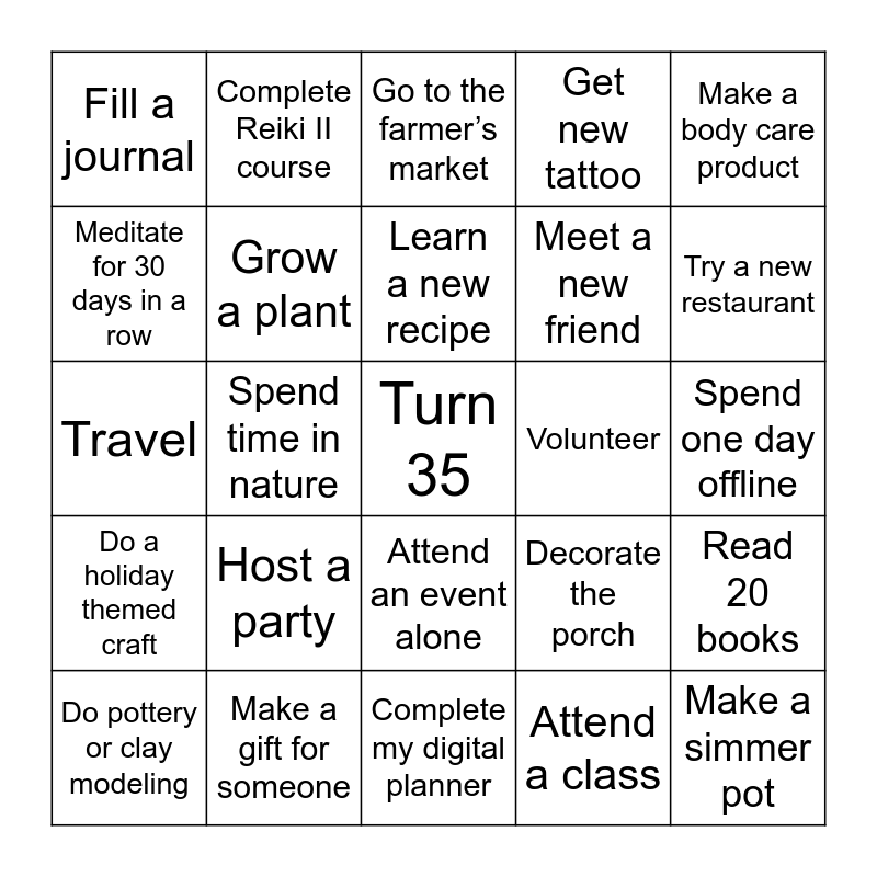 This bingo card has a free space and 24 words: Host a party, Make a gift for someone, Learn a new recipe, Do pottery or clay modeling, Make a body care product, Fill a journal, Meditate for 30 days in a row, Complete Reiki II course, Volunteer, Attend an event alone, Meet a new friend, Travel, Decorate the porch, Read 20 books, Grow a plant, Attend a class, Spend one day offline, Go to the farmer’s market, Try a new restaurant, Spend time in nature, Make a simmer pot, Do a holiday themed craft, Get new tattoo and Complete my digital planner.
