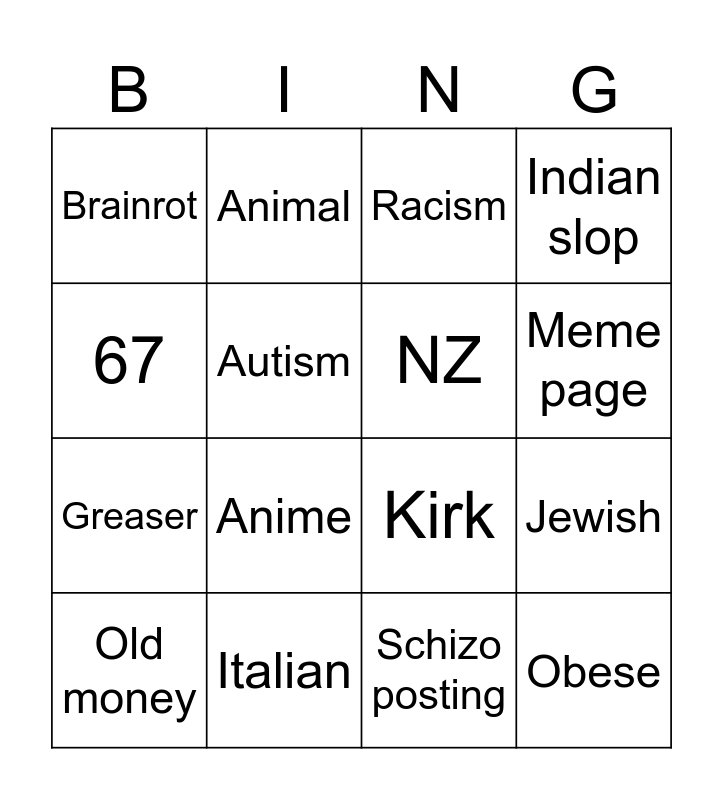 This bingo card has 16 words: Italian, Jewish, Racism, Brainrot, Greaser, Animal, Kirk, Schizo posting, 67, Autism, Old money, Indian slop, Anime, Meme page, NZ and Obese.