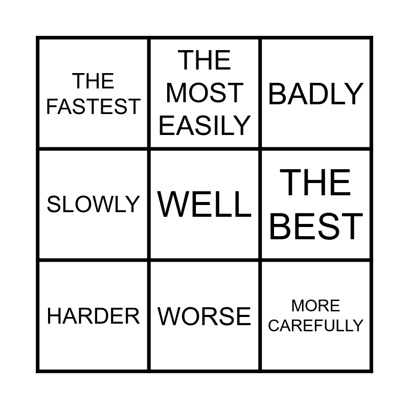 This bingo card has a free space and 8 words: THE BEST, BADLY, THE MOST EASILY, HARDER, THE FASTEST, MORE CAREFULLY, SLOWLY and WORSE.