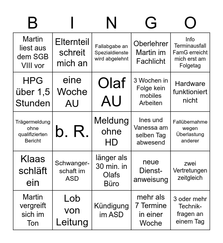 This bingo card has 25 words: Schwanger-schaft im ASD, Kündigung im ASD, Olaf AU, Martin vergreift sich im Ton, Info Terminausfall FamG erreicht mich erst am Folgetag, Martin liest aus dem SGB VIII vor, HPG über 1,5 Stunden, Elternteil schreit mich an, Ines und Vanessa am selben Tag abwesend, länger als 30 min. in Olafs Büro, 3 Wochen in Folge kein mobiles Arbeiten, Trägermeldung ohne qualifizierten Bericht, neue Dienst-anweisung, zwei Vertretungen zeitgleich, eine Woche AU, 3 oder mehr Technik-fragen an einem Tag, Fallübernahme wegen Überlastung anderer, Fallabgabe an Spezialdienste wird abgelehnt, Hardware funktioniert nicht, b. R., Meldung ohne HD, Lob von Leitung, Klaas schläft ein, Oberlehrer Martin im Fachlicht and mehr als 7 Termine in einer Woche.