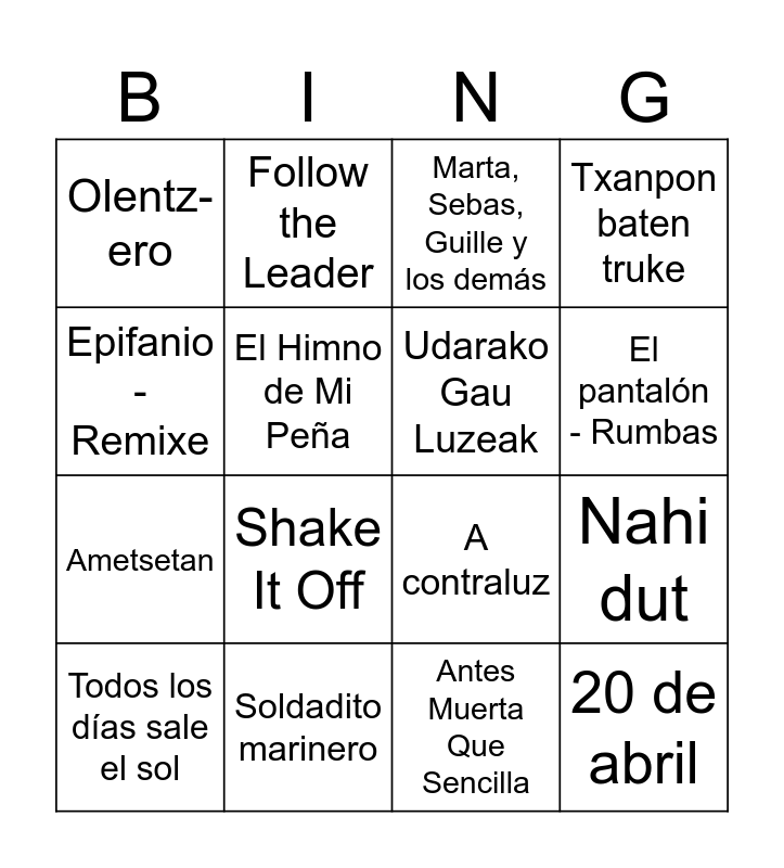 This bingo card has 57 words: Free!, Pirata alferrak, Txis, pun, Korrika!, Olentz-ero, Zure doinua - Malakias Remixe, Kaixo!, Udarako Gau Luzeak, Aukera Berriak, Ametsetan, Arratsalde Honetan, Txanpon baten truke, Musturrek sarkunde, Furra Furra, Lokaleko Leihotik, Porru Patata, Mari Kalambre, Epifanio - Remixe, Nahi dut, Palillos y Panderos - Remix, Todos los días sale el sol, Soldadito marinero, Ikusi Mendizaleak, Maite Zaitut, Marta, Sebas, Guille y los demás, A toda mecha, El pantalón - Rumbas, Mari Carmen, Sarandonga, Shake It Off, Ilargia, Sexuarekin, Munde Berri Baten Mapa, Baskonia, Alboka, Antes Muerta Que Sencilla, El Himno de Mi Peña, La senda del tiempo, A contraluz, Por la Raja de Tu Falda, 20 de abril, Follow the Leader, Waka Waka, El Burrito Sabanero, Olentzero ta Astoa, La Morocha, Hacia la Luna, Fireball, Yo Quiero Bailar, Danza Kuduro, Beste Behin, Entre poetas y presos, ¡No me toques las palmas que me conozco!, Fiesta Buena, Sueños de Color, Iritsi da Eguna, Baloreak and Euskararen Txantxangorria.
