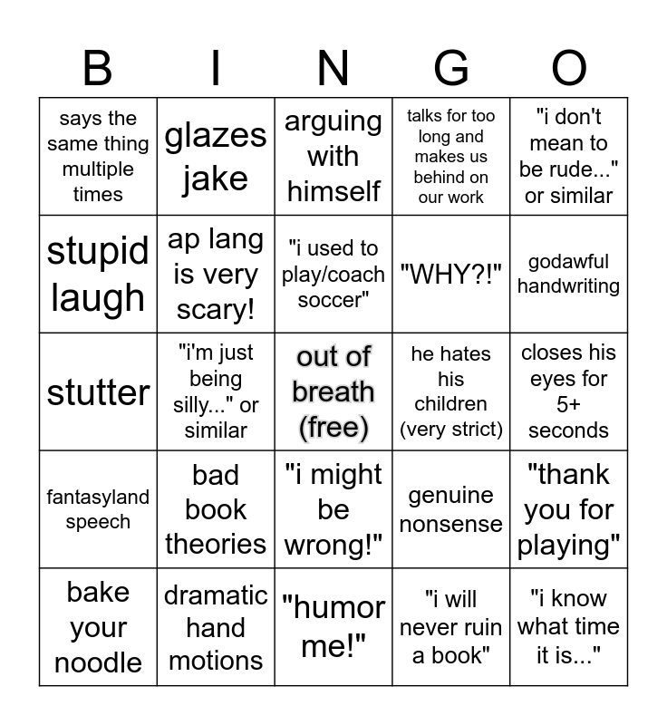This bingo card has a free space and 34 words: "don't poke the bear!", "i will never ruin a book", "rhymes with snow..." or similar, "the nice part of me...", fantasyland speech, ap lang is very scary!, "i don't mean to be rude..." or similar, bake your noodle, glazes jake, cough word cough, "i used to play/coach soccer", arguing with himself, "i'm not trying to scare you, i'm trying to prepare you", keeps adding onto himself, he hates his children (very strict), godawful handwriting, dramatic hand motions, stutter, bad book theories, genuine nonsense, "i might be wrong!", dramatic pausing, says the same thing multiple times, closes his eyes for 5+ seconds, "humor me!", "i know what time it is...", talks for too long and makes us behind on our work, "i dont like to waste time", "WHY?!", stupid laugh, "you think i'm rambling..." or similar, "i'm just being silly..." or similar, "thank you for playing" and baseball metaphors.