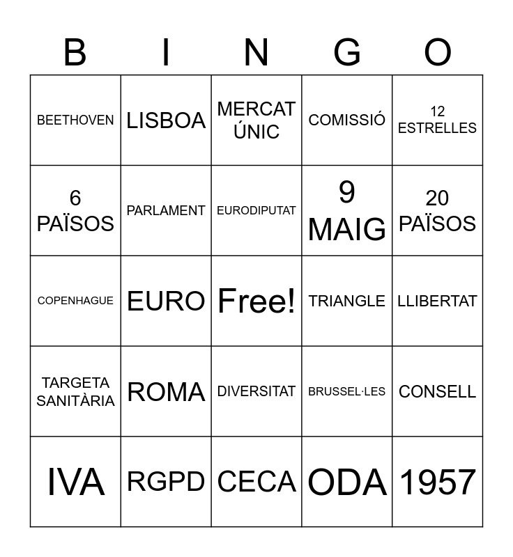 This bingo card has a free space and 51 words: 1951, 1957, 1992, CECA, ROMA, MAASTRICHT, LISBOA, SCHUMAN, 6 PAÏSOS, 27 PAÏSOS, PARLAMENT, COMISSIÓ, CONSELL, BRUSSEL·LES, ESTRASBURG, VON DER LEYEN, EURODIPUTAT, TRIANGLE, BANDERA, 12 ESTRELLES, EURO, ODA, BEETHOVEN, 9 MAIG, BLAU I DAURAT, HIMNE, 20 PAÏSOS, ZONA EURO, IVA, MERCAT ÚNIC, ARANZELS, COMERÇ, PRESSUPOST, COHESIÓ, ERASMUS, RGPD, SCHENGEN, PASSAPORT, CIUTADANIA, CARTA DRETS, LLIBERTAT, TARGETA SANITÀRIA, BREXIT, REGNE UNIT, 2020, UCRAÏNA, COPENHAGUE, CANDIDAT, PAU, DIVERSITAT and UNIÓ.