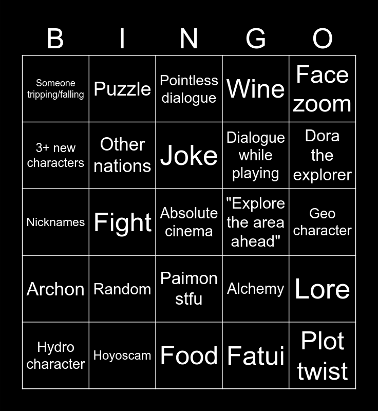 This bingo card has 25 words: Random, Food, Joke, Hydro character, Face zoom, Someone tripping/falling, 3+ new characters, Puzzle, "Explore the area ahead", Paimon stfu, Dialogue while playing, Nicknames, Alchemy, Lore, Other nations, Plot twist, Geo character, Pointless dialogue, Dora the explorer, Fight, Absolute cinema, Hoyoscam, Archon, Wine and Fatui.