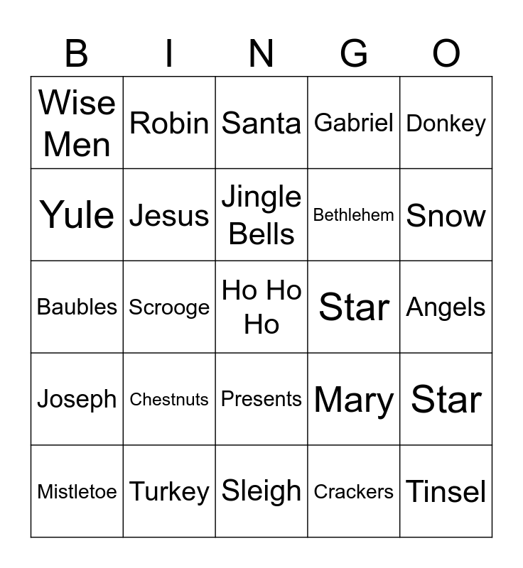 This bingo card has 36 words: Free!, Decorations, Rudolph, Jesus, Mary, Joseph, Jingle Bells, Manger, Donkey, Grinch, Scrooge, Gabriel, Shepherds, Star, Snow, Wise Men, Tinsel, Chestnuts, Ho Ho Ho, Santa, Angels, Star, Turkey, Mistletoe, Sleigh, Robin, Baubles, Celebration, Bethlehem, Yule, Tinsel, Holly, Crackers, Presents, Mince Pies and Carols.