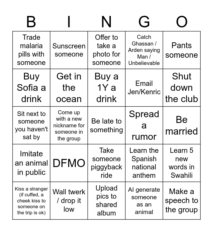 This bingo card has 25 words: DFMO, Upload pics to shared album, Buy a 1Y a drink, Kiss a stranger (if cuffed, a cheek kiss to someone on the trip is ok), Pants someone, Trade malaria pills with someone, Buy Sofia a drink, Sunscreen someone, Spread a rumor, Take someone piggyback ride, Email Jen/Kenric, Sit next to someone you haven't sat by, Learn the Spanish national anthem, Learn 5 new words in Swahili, Get in the ocean, Make a speech to the group, Be married, Offer to take a photo for someone, Shut down the club, Come up with a new nickname for someone in the group, Be late to something, Wall twerk / drop it low, Imitate an animal in public, Catch Ghassan / Arden saying Man / Unbelievable and AI generate someone as an animal.