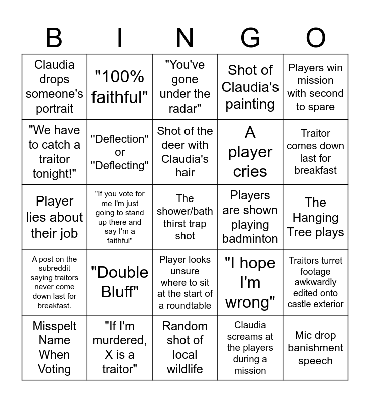 This bingo card has a free space and 24 words: Misspelt Name When Voting, "Double Bluff", Shot of the deer with Claudia's hair, Claudia screams at the players during a mission, Players win mission with second to spare, Claudia drops someone's portrait, "100% faithful", "You've gone under the radar", Players are shown playing badminton, The Hanging Tree plays, Player lies about their job, "Deflection" or "Deflecting", "I hope I'm wrong", Traitors turret footage awkwardly edited onto castle exterior, "We have to catch a traitor tonight!", "If I'm murdered, X is a traitor", Random shot of local wildlife, Shot of Claudia's painting, Traitor comes down last for breakfast, A post on the subreddit saying traitors never come down last for breakfast., "If you vote for me I'm just going to stand up there and say I'm a faithful", Player looks unsure where to sit at the start of a roundtable, A player cries and Mic drop banishment speech.