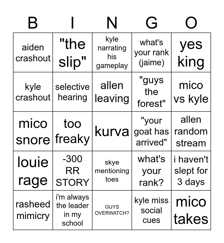 This bingo card has 25 words: -300 RR STORY, GUYS OVERWATCH?, allen leaving, rasheed mimicry, yes king, aiden crashout, kyle crashout, "the slip", "your goat has arrived", skye mentioning toes, "guys the forest", mico snore, what's your rank?, i haven't slept for 3 days, selective hearing, mico takes, allen random stream, kyle narrating his gameplay, mico vs kyle, too freaky, kurva, i'm always the leader in my school, louie rage, what's your rank (jaime) and kyle miss social cues.