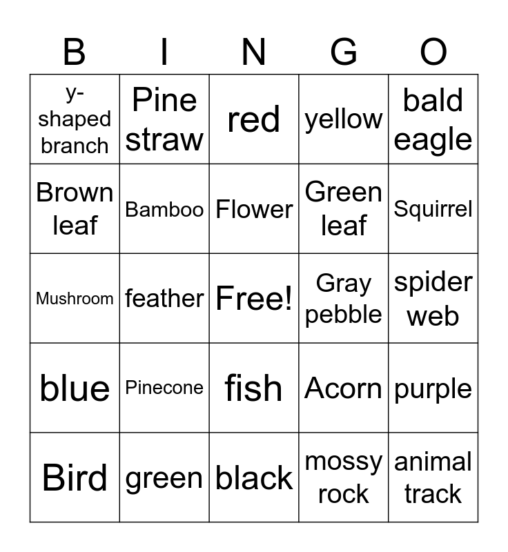 This bingo card has a free space and 27 words: Acorn, orange, Green leaf, black, Brown leaf, red, Pine straw, blue, Gray pebble, purple, Mushroom, yellow, Bird, green, Squirrel, pink, Bamboo, Flower, Pinecone, y-shaped branch, spider web, mossy rock, feather, animal track, fish, bald eagle and boat ramp.