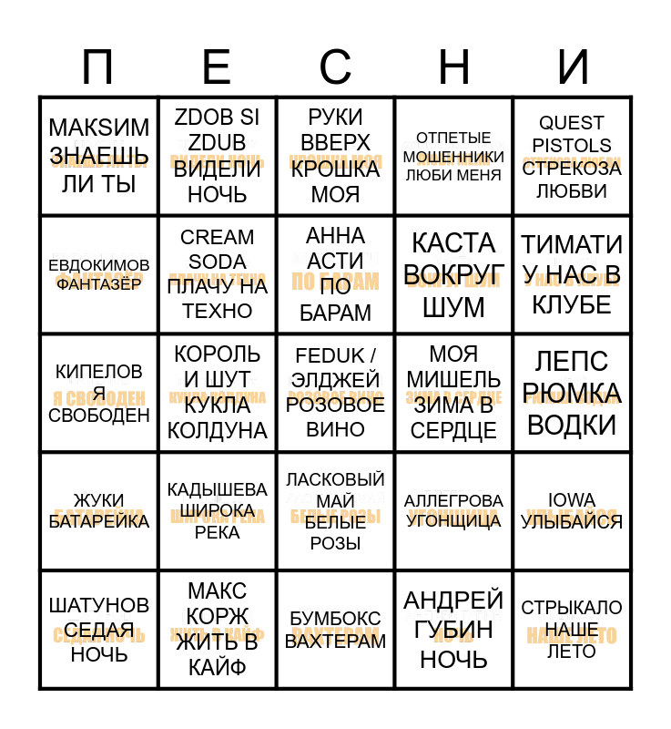 This bingo card has 30 images and 30 words: МАКС КОРЖ ЖИТЬ В КАЙФ, АННА АСТИ ЦАРИЦА, КОРОЛЬ И ШУТ КУКЛА КОЛДУНА, ТОКАРЕВ 7 ЛЕПЕСТОК, МАКSИМ ЗНАЕШЬ ЛИ ТЫ, РУКИ ВВЕРХ КРОШКА МОЯ, CREAM SODA ПЛАЧУ НА ТЕХНО, ЛАСКОВЫЙ МАЙ БЕЛЫЕ РОЗЫ, МОЯ МИШЕЛЬ ЗИМА В СЕРДЦЕ, БУМБОКС ВАХТЕРАМ, ЛЕПС РЮМКА ВОДКИ, FEDUK / ЭЛДЖЕЙ РОЗОВОЕ ВИНО, АНДРЕЙ ГУБИН НОЧЬ, СТРЫКАЛО НАШЕ ЛЕТО, ТИМАТИ У НАС В КЛУБЕ, ЗВЕРИ РАЙОНЫ КВАРТАЛЫ, АЛЛЕГРОВА УГОНЩИЦА, ЖУКИ БАТАРЕЙКА, КАДЫШЕВА ШИРОКА РЕКА, QUEST PISTOLS СТРЕКОЗА ЛЮБВИ, КИПЕЛОВ Я СВОБОДЕН, ПЕВИЦА ЁЛКА НА ШАРЕ, ZDOB SI ZDUB ВИДЕЛИ НОЧЬ, КАСТА ВОКРУГ ШУМ, ЕВДОКИМОВ ФАНТАЗЁР, ОТПЕТЫЕ МОШЕННИКИ ЛЮБИ МЕНЯ, IOWA УЛЫБАЙСЯ, ШАТУНОВ СЕДАЯ НОЧЬ, АННА АСТИ ПО БАРАМ and ЧИЖ & СО О ЛЮБВИ.