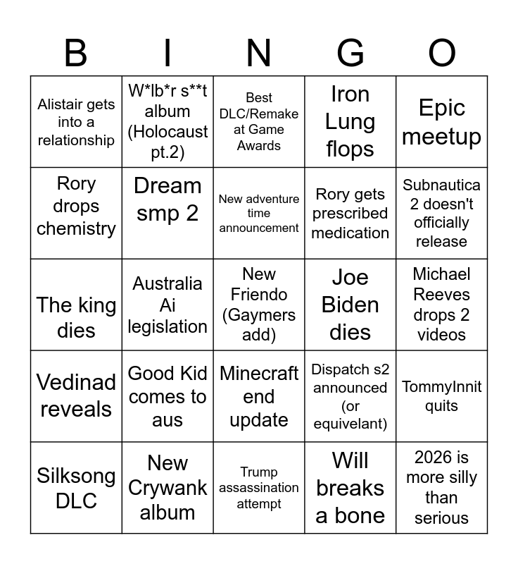 This bingo card has a free space and 24 words: Good Kid comes to aus, New Crywank album, New adventure time announcement, Silksong DLC, Epic meetup, Alistair gets into a relationship, Rory drops chemistry, W*lb*r s**t album (Holocaust pt.2), Joe Biden dies, Minecraft end update, Rory gets prescribed medication, The king dies, Dispatch s2 announced (or equivelant), TommyInnit quits, Dream smp 2, Will breaks a bone, Michael Reeves drops 2 videos, Best DLC/Remake at Game Awards, Subnautica 2 doesn't officially release, Australia Ai legislation, 2026 is more silly than serious, Vedinad reveals, Iron Lung flops and Trump assassination attempt.