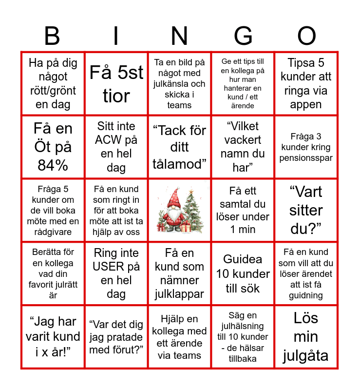 This bingo card has a free space and 24 words: Ring inte USER på en hel dag, “Var det dig jag pratade med förut?”, “Tack för ditt tålamod”, “Jag har varit kund i x år!”, Tipsa 5 kunder att ringa via appen, Ha på dig något rött/grönt en dag, Få en Öt på 84%, Få 5st tior, Få ett samtal du löser under 1 min, Få en kund som nämner julklappar, “Vilket vackert namn du har”, Fråga 5 kunder om de vill boka möte med en rådgivare, Guidea 10 kunder till sök, Få en kund som vill att du löser ärendet att ist få guidning, Sitt inte ACW på en hel dag, Säg en julhälsning till 10 kunder - de hälsar tillbaka, “Vart sitter du?”, Ta en bild på något med julkänsla och skicka i teams, Fråga 3 kunder kring pensionsspar, Få en kund som ringt in för att boka möte att ist ta hjälp av oss, Lös min julgåta, Berätta för en kollega vad din favorit julrätt är, Ge ett tips till en kollega på hur man hanterar en kund / ett ärende and Hjälp en kollega med ett ärende via teams.