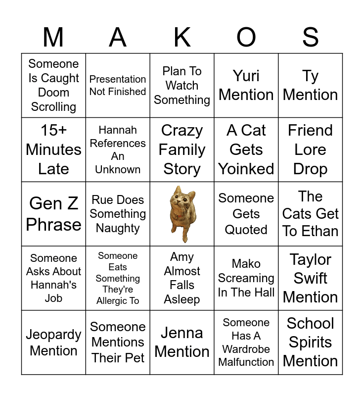 This bingo card has a free space and 40 words: Past Presentation Mention, Rue Does Something Naughty, Hannah Throws A "Spencerism" Into Conversation, Someone Gets Quoted, Someone Spills Something, Jeopardy Mention, Hannah References An Unknown, Survivor Mention, A Cat Gets Yoinked, Taylor Swift Mention, Gen Z Phrase, Presentation Not Finished, Someone Has A Wardrobe Malfunction, The Cats Get To Ethan, Someone Asks About Hannah's Job, Someone Eats Something They're Allergic To, Woodmans Mention, Yuri Mention, Amy Mentions An Unknown Anime, Someone Is Caught Doom Scrolling, Someone Mentions Their Pet, Crazy Family Story, Mako Screaming In The Hall, Friend Lore Drop, Zoë Gets Yelled At, Presentation Goes Wrong, Jenna Mention, Caleb And/Or Amy Play Chess, Someone Says A Word Weird, Ali Mention, Smosh Quote, Plan To Watch Something, Oas Bros Mention, School Spirits Mention, 15+ Minutes Late, Someone Spikes Their Drink, Amy Almost Falls Asleep, High School Tale, Ty Mention and Someone Sings.
