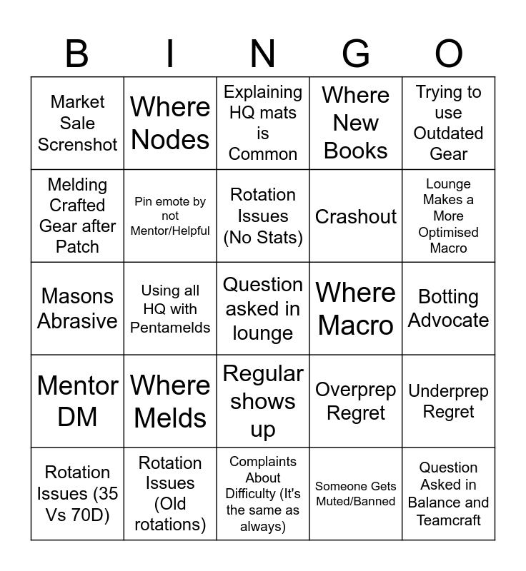 This bingo card has a free space and 24 words: Where Melds, Rotation Issues (Old rotations), Rotation Issues (No Stats), Rotation Issues (35 Vs 70D), Trying to use Outdated Gear, Market Sale Screnshot, Melding Crafted Gear after Patch, Where Nodes, Where Macro, Regular shows up, Crashout, Masons Abrasive, Overprep Regret, Underprep Regret, Pin emote by not Mentor/Helpful, Someone Gets Muted/Banned, Botting Advocate, Explaining HQ mats is Common, Lounge Makes a More Optimised Macro, Using all HQ with Pentamelds, Question Asked in Balance and Teamcraft, Mentor DM, Where New Books and Complaints About Difficulty (It's the same as always).