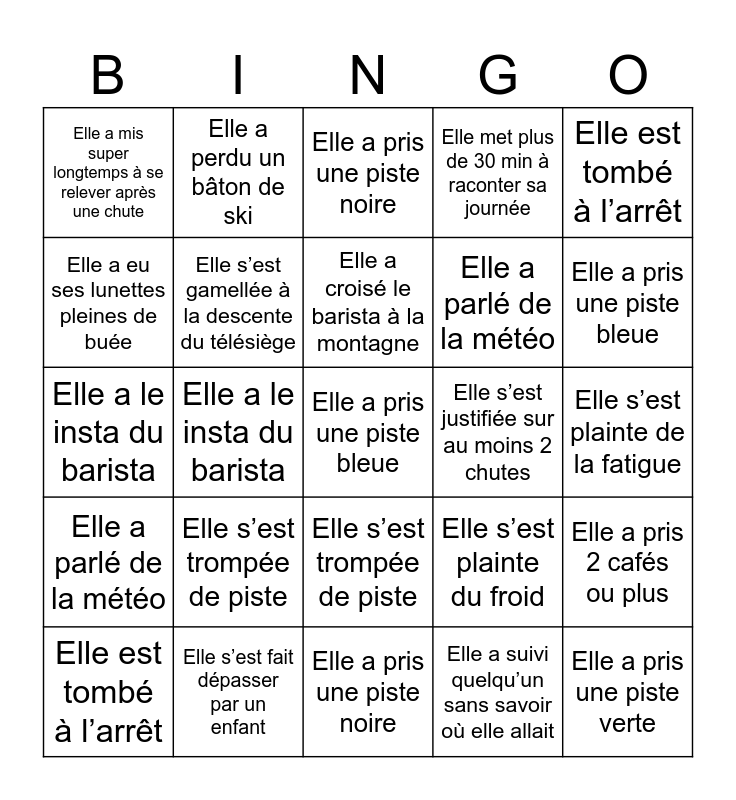 This bingo card has 50 words: Elle a pris une piste verte, Elle a pris une piste bleue, Elle a pris une piste rouge, Elle a pris une piste noire, Elle s’est trompée de piste, Elle est tombée plus de 5 fois, Elle a perdu un bâton de ski, Elle s’est fait engueuler par l’opérateur, Elle a eu ses lunettes pleines de buée, Elle s’est fait dépasser par un enfant, Elle s’est gamellée à la descente du télésiège, Elle met plus de 30 min à raconter sa journée, Elle a pris 2 cafés ou plus, Elle s’est plainte du froid, Elle s’est plainte de la fatigue, Elle a pris plus de 10 photos du paysage, Elle a croisé le barista à la montagne, Elle s’est justifiée sur au moins 2 chutes, Elle a attendu longtemps à une remontée mécanique, Elle est tombé à l’arrêt, Elle a le insta du barista, Elle a suivi quelqu’un sans savoir où elle allait, Elle a mis super longtemps à se relever après une chute, Elle a parlé de la météo, Elle a mal aux jambes, Elle a pris une piste verte, Elle a pris une piste bleue, Elle a pris une piste rouge, Elle a pris une piste noire, Elle s’est trompée de piste, Elle est tombée plus de 5 fois, Elle a perdu un bâton de ski, Elle s’est fait engueuler par l’opérateur, Elle a eu ses lunettes pleines de buée, Elle s’est fait dépasser par un enfant, Elle s’est gamellée à la descente du télésiège, Elle met plus de 30 min à raconter sa journée, Elle a pris 2 cafés ou plus, Elle s’est plainte du froid, Elle s’est plainte de la fatigue, Elle a pris plus de 10 photos du paysage, Elle a croisé le barista à la montagne, Elle s’est justifiée sur au moins 2 chutes, Elle a attendu longtemps à une remontée mécanique, Elle est tombé à l’arrêt, Elle a le insta du barista, Elle a suivi quelqu’un sans savoir où elle allait, Elle a mis super longtemps à se relever après une chute, Elle a parlé de la météo and Elle a mal aux jambes.