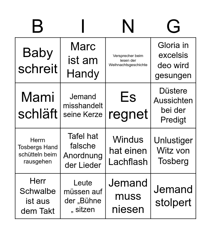 This bingo card has 16 words: Herr Schwalbe ist aus dem Takt, Leute müssen auf der „Bühne „ sitzen, Versprecher beim lesen der Weihnachtsgeschichte, Gloria in excelsis deo wird gesungen, Mami schläft, Marc ist am Handy, Windus hat einen Lachflash, Unlustiger Witz von Tosberg, Baby schreit, Jemand misshandelt seine Kerze, Jemand muss niesen, Düstere Aussichten bei der Predigt, Herrn Tosbergs Hand schütteln beim rausgehen, Tafel hat falsche Anordnung der Lieder, Es regnet and Jemand stolpert.