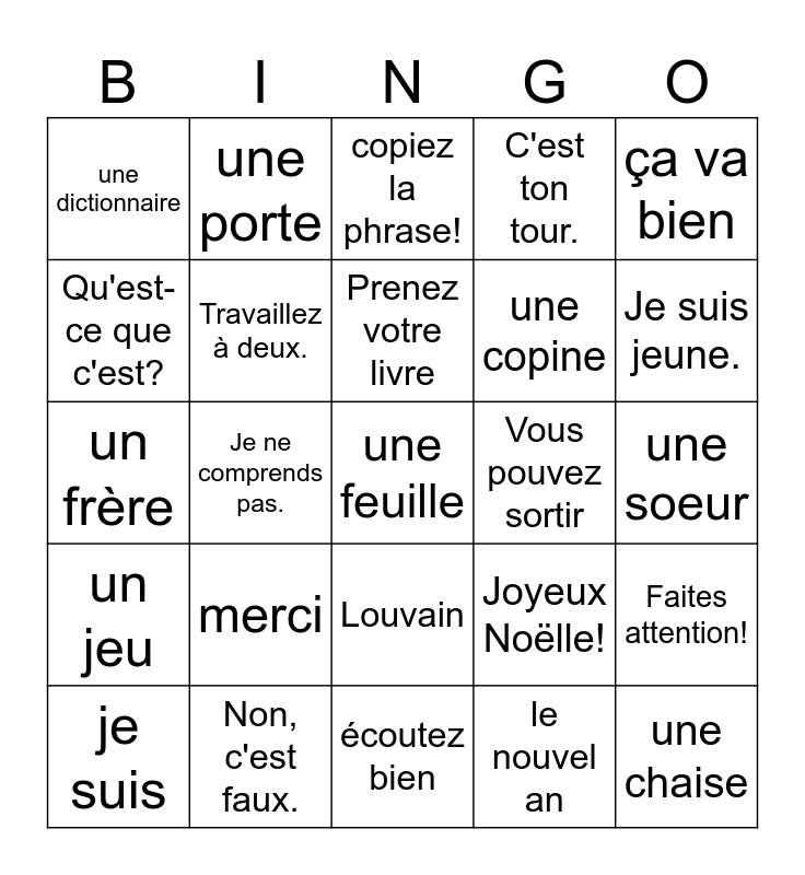This bingo card has a free space and 24 words: merci, Non, c'est faux., Prenez votre livre, je suis, ça va bien, une dictionnaire, Qu'est-ce que c'est?, une porte, Vous pouvez sortir, Louvain, une copine, un frère, Joyeux Noëlle!, Faites attention!, Travaillez à deux., le nouvel an, une soeur, copiez la phrase!, Je suis jeune., Je ne comprends pas., une chaise, un jeu, C'est ton tour. and écoutez bien.
