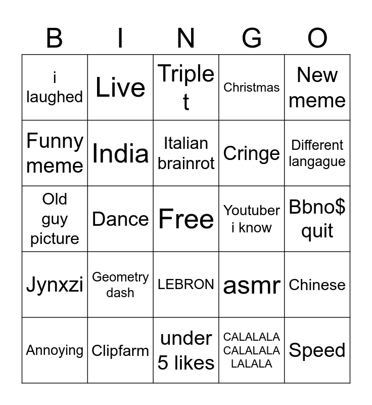 This bingo card has a free space and 24 words: Geometry dash, Clipfarm, Italian brainrot, Annoying, New meme, i laughed, Funny meme, Live, Youtuber i know, LEBRON, Cringe, Old guy picture, asmr, Chinese, India, CALALALA CALALALA LALALA, Bbno$ quit, Triple t, Different langague, Dance, Speed, Jynxzi, Christmas and under 5 likes.