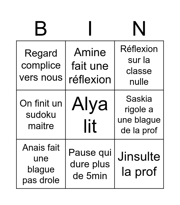 This bingo card has a free space and 8 words: Saskia rigole a une blague de la prof, Réflexion sur la classe nulle, Amine fait une réflexion, Anais fait une blague pas drole, Regard complice vers nous, Jinsulte la prof, On finit un sudoku maitre and Pause qui dure plus de 5min.