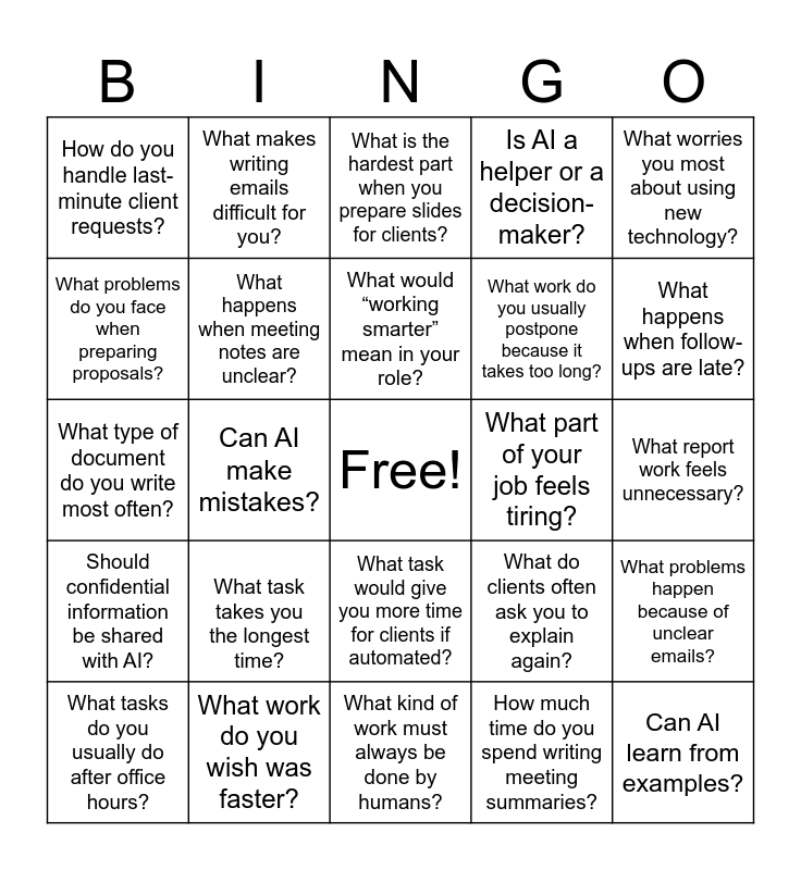 This bingo card has a free space and 24 words: What task takes you the longest time?, What work do you wish was faster?, What would “working smarter” mean in your role?, What tasks do you usually do after office hours?, What worries you most about using new technology?, How do you handle last-minute client requests?, What problems do you face when preparing proposals?, What makes writing emails difficult for you?, What part of your job feels tiring?, What task would give you more time for clients if automated?, What work do you usually postpone because it takes too long?, What type of document do you write most often?, What do clients often ask you to explain again?, What problems happen because of unclear emails?, What happens when meeting notes are unclear?, How much time do you spend writing meeting summaries?, What report work feels unnecessary?, What is the hardest part when you prepare slides for clients?, What happens when follow-ups are late?, Can AI make mistakes?, Can AI learn from examples?, Should confidential information be shared with AI?, Is AI a helper or a decision-maker? and What kind of work must always be done by humans?.
