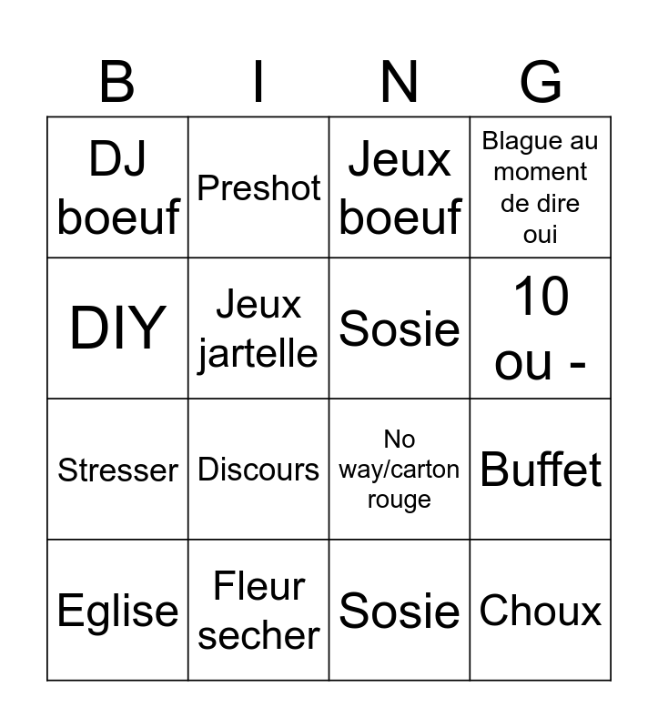 This bingo card has 16 words: Fleur secher, Buffet, Jeux boeuf, DJ boeuf, Stresser, Preshot, No way/carton rouge, Sosie, DIY, Jeux jartelle, Eglise, Blague au moment de dire oui, Discours, 10 ou -, Sosie and Choux.