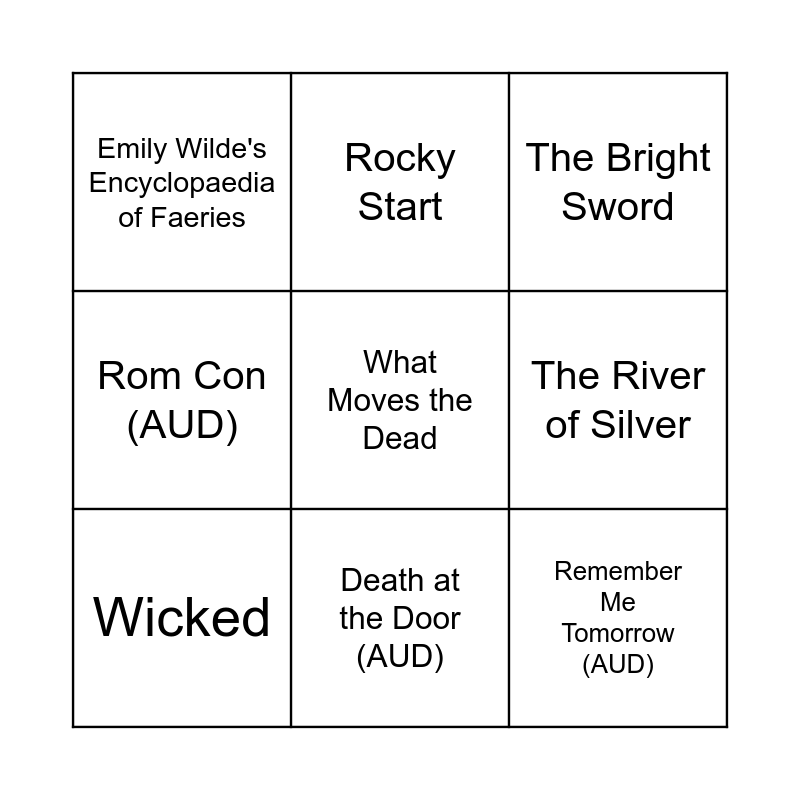 This bingo card has a free space and 8 words: The River of Silver, The Bright Sword, Rocky Start, Wicked, Emily Wilde's Encyclopaedia of Faeries, Remember Me Tomorrow (AUD), Rom Con (AUD) and Death at the Door (AUD).