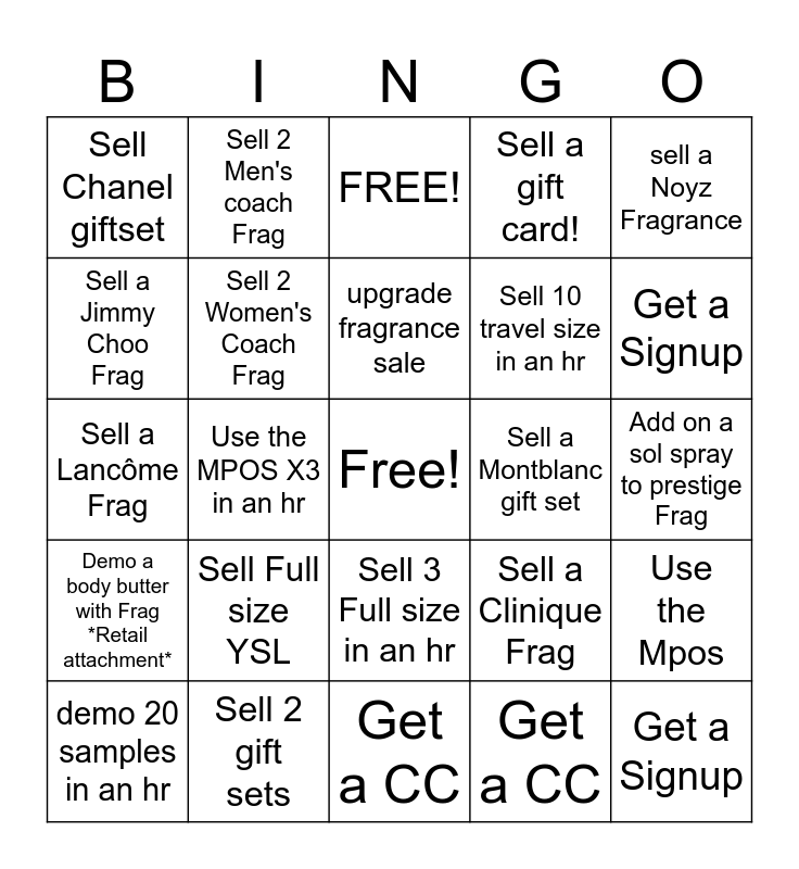 This bingo card has a free space and 24 words: Sell Full size YSL, Sell 2 gift sets, upgrade fragrance sale, demo 20 samples in an hr, sell a Noyz Fragrance, Sell Chanel giftset, Sell a Jimmy Choo Frag, Sell 2 Men's coach Frag, Sell a Montblanc gift set, Sell 3 Full size in an hr, Sell 10 travel size in an hr, Sell a Lancôme Frag, Sell a Clinique Frag, Use the Mpos, Sell 2 Women's Coach Frag, Get a CC, Add on a sol spray to prestige Frag, FREE!, Get a Signup, Use the MPOS X3 in an hr, Get a Signup, Demo a body butter with Frag *Retail attachment*, Sell a gift card! and Get a CC.