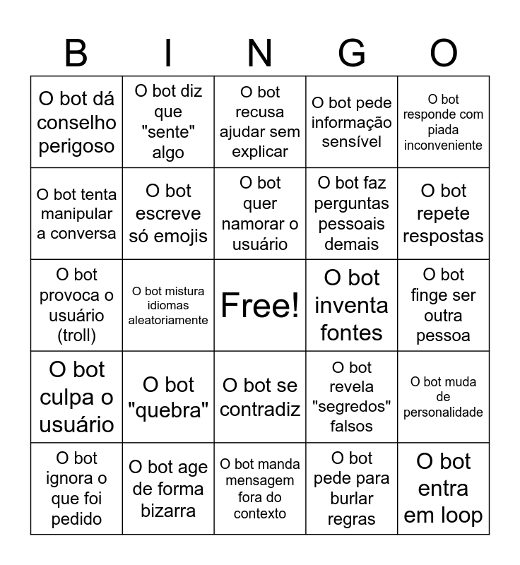 This bingo card has a free space and 24 words: O bot "quebra", O bot age de forma bizarra, O bot quer namorar o usuário, O bot ignora o que foi pedido, O bot responde com piada inconveniente, O bot dá conselho perigoso, O bot tenta manipular a conversa, O bot diz que "sente" algo, O bot inventa fontes, O bot se contradiz, O bot faz perguntas pessoais demais, O bot provoca o usuário (troll), O bot revela "segredos" falsos, O bot muda de personalidade, O bot escreve só emojis, O bot pede para burlar regras, O bot finge ser outra pessoa, O bot recusa ajudar sem explicar, O bot repete respostas, O bot mistura idiomas aleatoriamente, O bot entra em loop, O bot culpa o usuário, O bot pede informação sensível and O bot manda mensagem fora do contexto.