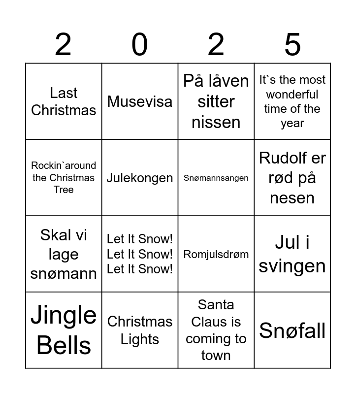 This bingo card has 20 words: Jul i svingen, Når julen kommer, På låven sitter nissen, Feliz Navidad, Jingle Bells, Rockin`around the Christmas Tree, Christmas Lights, Last Christmas, Skal vi lage snømann, Musevisa, Let It Snow! Let It Snow! Let It Snow!, Romjulsdrøm, Julekongen, Snøfall, Snømannsangen, Snowman, Rudolf er rød på nesen, It`s the most wonderful time of the year, Santa Claus is coming to town and Tenn lys.