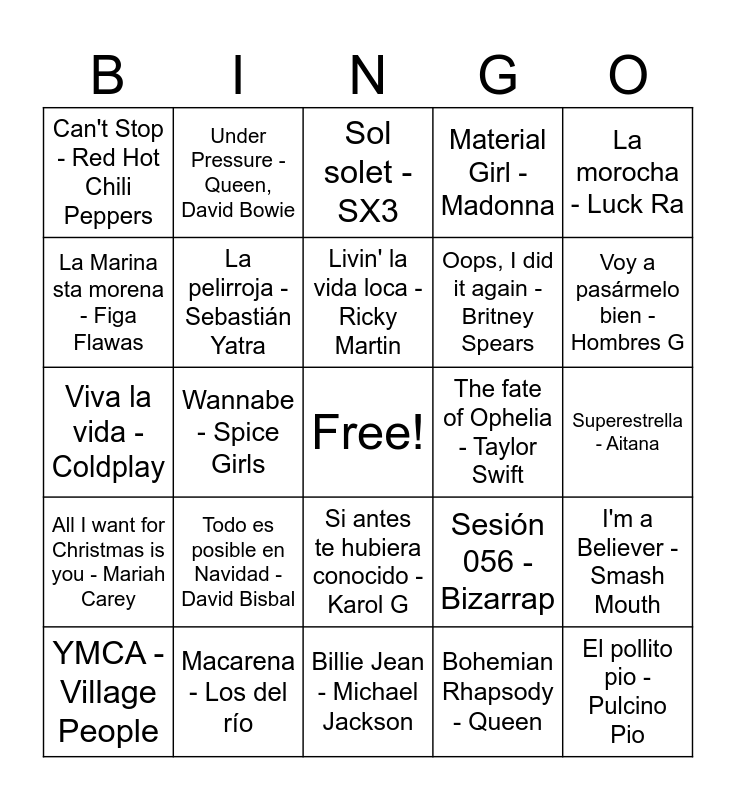 This bingo card has a free space and 29 words: YMCA - Village People, Dancing queen - ABBA, Wannabe - Spice Girls, La gent que estimo - Oques Grasses, Can't Stop - Red Hot Chili Peppers, Sol solet - SX3, La pelirroja - Sebastián Yatra, Todo es posible en Navidad - David Bisbal, The fate of Ophelia - Taylor Swift, Macarena - Los del río, Superestrella - Aitana, El pollito pio - Pulcino Pio, Billie Jean - Michael Jackson, Bohemian Rhapsody - Queen, Voy a pasármelo bien - Hombres G, Back to Black - Amy Winehouse, Si antes te hubiera conocido - Karol G, All I want for Christmas is you - Mariah Carey, La morocha - Luck Ra, Viva la vida - Coldplay, Sesión 056 - Bizarrap, Los peces en el río - David Bisbal, Oops, I did it again - Britney Spears, La Marina sta morena - Figa Flawas, Material Girl - Madonna, Under Pressure - Queen, David Bowie, I'm a Believer - Smash Mouth, Livin' la vida loca - Ricky Martin and Aserejé - Las ketchup.