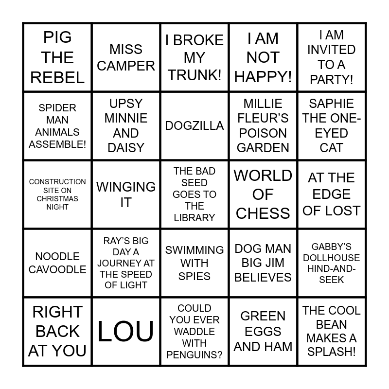 This bingo card has 144 words: Free!, MARKER, GRUMPY MONKEY PLAY ALL DAY, THE TAYLORS, SMILEY, DOG MAN BIG JIM BELIEVES, SNOOP, 12 STRAYS OF CHRISTMAS, MIXED-UP, SQUISHED, THE TERRIBLE TRIO, DIARY OF A PUG SUPER PUG, CHI CHI’S STORY, WHO WOULD WIN? UNDERWATER BATTLES, STITCH THE DOG SHOW, POCKET PEACHES AT THE FAIR, WATCH ME THROW THE BALL!, ANIMAL BITES, BLUEY THE DOCTOR, BUBBLY BEAUTIFUL KITTY-CORN, THE REFLECTION IN ME, GABBY’S DOLLHOUSE HIND-AND-SEEK, G.O.A.T., FOOTBALL SUPERSTARS, THE BAD GUYS JOKE BOOK, WINGING IT, MISS CAMPER, THE UNOFFICIAL GUIDE TO MARIO KART, WINGS OF FIRE: DARKSTALKER, SEARCH AND RESCUE, ESCAPE FROM ALCATRAZ, BLOOD IN THE WATER, WAR GAMES, AT THE EDGE OF LOST, I SURVIVED THE DUST BOWL 1935, MONSTER TRUCKS, DRAGON MASTERS RETURN OF THE LEGENDARY DRAGON, DIARY OF A WIMPY KID PARTY POOPER, MILLIE FLEUR’S POISON GARDEN, FAKER, THE LAST KIDS ON EARTH AND THE FORBIDDEN FORTRESS, SCHOOL FOR UNUSUAL MAGIC, SWIMMING WITH SPIES, RESIST HEROES, SPY NINJAS NEW RECRUITS, WHO IS SHAQUILLE O’NEAL?, THE ONE AND ONLY RUBY, OUT OF MY MIND, TACO TUESDAYS, PARACHUTE KIDS, PICTURE DAY, SISTERS, RIGHT BACK AT YOU, OWL DIARIES EVA AND THE NEW TEACHER, SPORTS ZONE! HUT! HUT! HIKE!, DIVE INTO SHARKS, TARANTULAS!, MEET THE PLANETS, WACKY WILD ANIMALS, WORLD’S CUTEST CATS & KITTENS, THE COOL BEAN MAKES A SPLASH!, GREEN EGGS AND HAM, PETE THE CAT SCUBA-CAT, I WANT TO SLEEP UNDER THE STARS!, THE SMART COOKIE, NOODLE CAVOODLE, NOTHING EVER HAPPENS, NOT FAIR, BEAR!, THE TEENY-WEENY UNICORN, DEFINITELY DO NOT OPEN THIS BOOK, THE PIGEON HAS TO GO TO SCHOOL!, PIG THE REBEL, CONSTRUCTION SITE ON CHRISTMAS NIGHT, CRYSTAL POWER!, 2026 WORLD RECORDS, HOW TO CATCH SANTA CLAUS, THE POLAR BEAR WHO SAVED CHRISTMAS, OTTO THE ORNAMENT, I AM NOT HAPPY!, BUFFALO FLUFFALO AND PUFFALO, PIKACHU’S NIGHTTIME ADVENTURE, THE GIFT OF WORDS, DON’T LET THE PIGEON DRIVE THE SLEIGH!, WHATEVER AFTER FAIREST OF ALL, SAPHIE THE ONE-EYED CAT, SUPER DINOSAUR ENCYCLOPEDIA, WORLD OF CHESS, WE DON’T EAT OUR CLASSMATES, COULD YOU EVER WADDLE WITH PENGUINS?, SONIC THE HEDGEHOG, BABY-SITTERS LITTLE SISTER KAREN’S GHOST, WISH I WAS A BALLER, THERE WAS AN OLD LADY WHO SWALLOWED A RAINBOW, LOU, CLIFFORD THE BIG RED DOG, TURKEY VS. SANTA, AROUND THE SPIDER-VERSE, THE BAD GUYS LET THE GAMES BEGIN!, CANDY CORN CHRISTMAS, PEPPA AND THE CHRISTMAS ELF, SPIDER MAN ANIMALS ASSEMBLE!, REPTILES ARE AWESOME, WHICH IS WORSE? ANIMAL CHALLENGES, SNAKES RULE!, DOGZILLA, WHAT IF YOU HAD T. REX TEETH?, STAY PAWSITIVE, 5,000 AWESOME FACTS ABOUT ANIMALS!, THE WORLD’S MOST POINTLESS ANIMALS, UPSY MINNIE AND DAISY, WISH, I BROKE MY TRUNK!, ARE YOU READY TO PLAY OUTSIDE?, I AM INVITED TO A PARTY!, THE BAD SEED GOES TO THE LIBRARY, PIZZA AND TACO ROCK OUT!, MERMAID DAYS THE SEA MONSTER, DRAGON HILL EMBER THE FIRE DRAGON, MOANA 2 BIRTHDAY TREASURE HUNT!, DORA WAKE UP, BIG RED CHICKEN!, RAINBOW DAYS THE GRAY DAY, WE SHALL OVERCOME, SPEEDYSAURUS, CHANGE SINGS, DONUT TOUCH!, AS COOL AS IT GETS, THE GOOD EGG, DON’T TOUCH THAT FLOWER!, WHERE ARE YOU FROM?, HIGH TOP THE SNEAKER THAT JUST CAN’T STOP!, LILO AND STITCH, BAA BAA BLACK BELT, A DUCK CALLED BRIAN, PIRANHAS DON’T EAT BANANAS, UNICORN YES DAY!, HELLO! MY NAME IS CAPYBARA, HELLO! MY NAME IS PINE CONE, PUGICORN THE CHRISTMAS WISH, HOT WHEELS ULTIMATE RACERS, RAY’S BIG DAY A JOURNEY AT THE SPEED OF LIGHT, OUR SOLAR SYSTEM! A STELLAR NEIGHBORHOOD, THE GRUMPY PIRATE, SHEEPISH (WOLF UNDER COVER) and WE’RE GOING ON A GINGERBREAD HUNT.