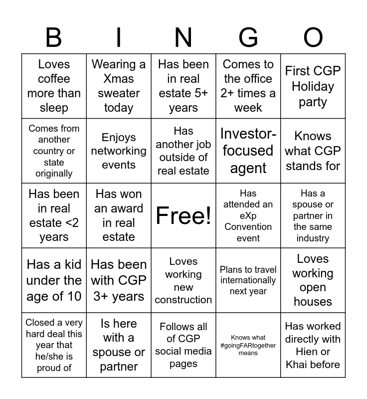 This bingo card has a free space and 24 words: Has been with CGP 3+ years, Is here with a spouse or partner, Has another job outside of real estate, Closed a very hard deal this year that he/she is proud of, First CGP Holiday party, Loves coffee more than sleep, Comes from another country or state originally, Wearing a Xmas sweater today, Has attended an eXp Convention event, Loves working new construction, Investor-focused agent, Has been in real estate <2 years, Plans to travel internationally next year, Loves working open houses, Enjoys networking events, Knows what #goingFARtogether means, Has a spouse or partner in the same industry, Has been in real estate 5+ years, Knows what CGP stands for, Has won an award in real estate, Has worked directly with Hien or Khai before, Has a kid under the age of 10, Comes to the office 2+ times a week and Follows all of CGP social media pages.