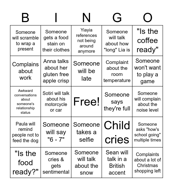 This bingo card has a free space and 24 words: Someone will say "6 - 7", Someone cries & gets sentimental, Someone will be late, "Is the food ready?", "Is the coffee ready", Someone will scramble to wrap a present, Complains about work, Someone gets a food stain on their clothes, Someone says they're full, Someone takes a selfie, Complaint about the room temperature, Awkward conversations about someone's relationship status, Child cries, Someone asks "how's school going" multiple times, Anna talks about her gluten free apple crisp, Sean will talk in a British accent, Someone will complain about the noise level, Yiayia references not being around anymore, Someone won't want to play a game, Sotiri will talk about his motorcycle or car, Complaints about a lot of Christmas shopping left, Paula will remind people not to feed the dog, Someone will talk about how "long" Lia is and Someone will talk about the snow.