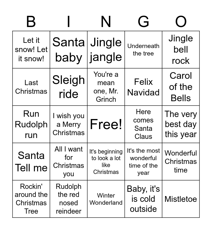 This bingo card has a free space and 24 words: All I want for Christmas you, Rudolph the red nosed reindeer, You're a mean one, Mr. Grinch, Rockin' around the Christmas Tree, Jingle bell rock, Let it snow! Let it snow!, Last Christmas, Santa baby, Here comes Santa Claus, It's beginning to look a lot like Christmas, Felix Navidad, Run Rudolph run, It's the most wonderful time of the year, Wonderful Christmas time, Sleigh ride, Baby, it's is cold outside, The very best day this year, Jingle jangle, Carol of the Bells, I wish you a Merry Christmas, Mistletoe, Santa Tell me, Underneath the tree and Winter Wonderland.