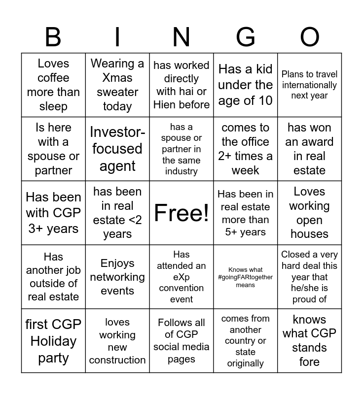 This bingo card has a free space and 24 words: Enjoys networking events, loves working new construction, has a spouse or partner in the same industry, first CGP Holiday party, Plans to travel internationally next year, Loves coffee more than sleep, Is here with a spouse or partner, Wearing a Xmas sweater today, Has been in real estate more than 5+ years, Has attended an eXp convention event, comes to the office 2+ times a week, Has been with CGP 3+ years, Knows what #goingFARtogether means, Closed a very hard deal this year that he/she is proud of, Investor-focused agent, comes from another country or state originally, Loves working open houses, has worked directly with hai or Hien before, has won an award in real estate, has been in real estate <2 years, knows what CGP stands fore, Has another job outside of real estate, Has a kid under the age of 10 and Follows all of CGP social media pages.