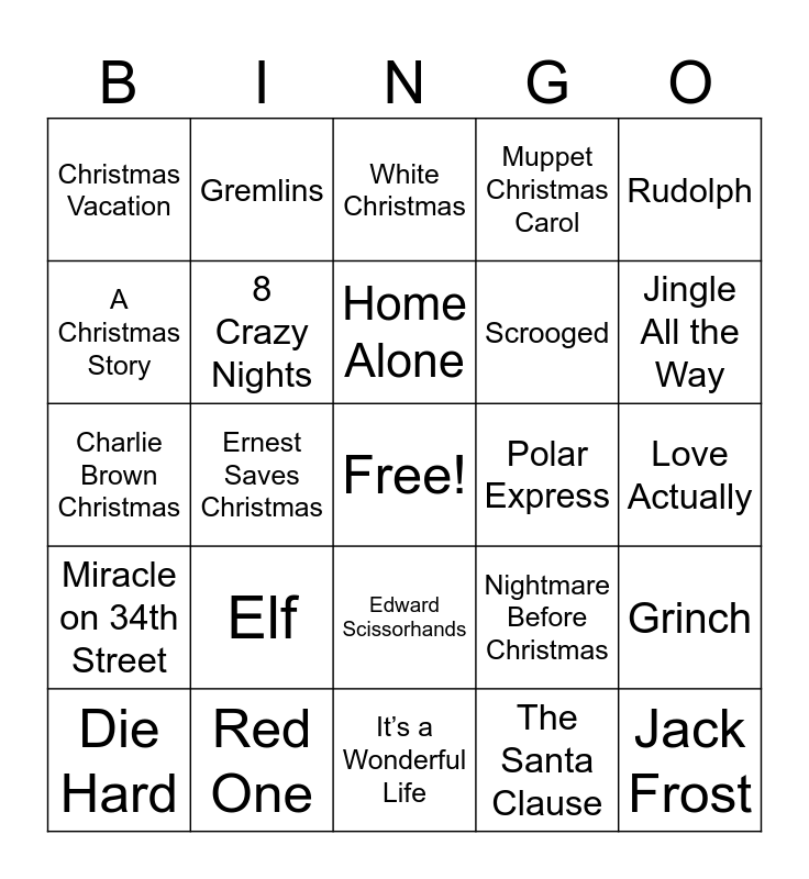 This bingo card has a free space and 25 words: Elf, It’s a Wonderful Life, Home Alone, Die Hard, Rudolph, Christmas Vacation, A Christmas Story, Gremlins, Polar Express, Edward Scissorhands, Scrooged, Charlie Brown Christmas, Nightmare Before Christmas, Grinch, 8 Crazy Nights, Frosty the Snowman, Love Actually, White Christmas, Jingle All the Way, Ernest Saves Christmas, Jack Frost, Red One, Miracle on 34th Street, Muppet Christmas Carol and The Santa Clause.