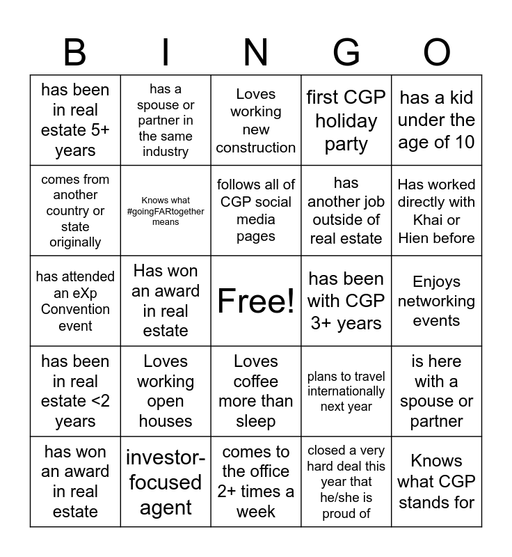 This bingo card has a free space and 24 words: Loves working open houses, investor-focused agent, follows all of CGP social media pages, has won an award in real estate, has a kid under the age of 10, has been in real estate 5+ years, comes from another country or state originally, has a spouse or partner in the same industry, has been with CGP 3+ years, Loves coffee more than sleep, has another job outside of real estate, has attended an eXp Convention event, plans to travel internationally next year, is here with a spouse or partner, Knows what #goingFARtogether means, closed a very hard deal this year that he/she is proud of, Enjoys networking events, Loves working new construction, Has worked directly with Khai or Hien before, Has won an award in real estate, Knows what CGP stands for, has been in real estate <2 years, first CGP holiday party and comes to the office 2+ times a week.