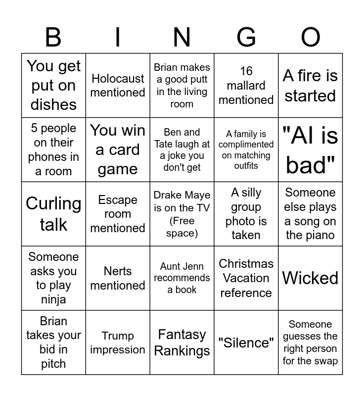This bingo card has a free space and 39 words: GD Sleeps, Someone mentions politics, "Lets go for a walk", You win a card game, Brian takes your bid in pitch, Aunt Jenn recommends a book, Ben and Tate laugh at a joke you don't get, Someone gets a new nickname, A fire is started, Someone asks you to play ninja, Escape room mentioned, 16 mallard mentioned, Someone guesses the right person for the swap, Someone else plays a song on the piano, A silly group photo is taken, Nerts mentioned, Something gets burned, You get put on dishes, Mariah Carey plays, Christmas Vacation reference, 5 people on their phones in a room, Fantasy Rankings, A family is complimented on matching outfits, "AI is bad", "How were the roads?", GM + GD mention florida, Not so secret santa, Gettysburg address mentioned, F1 talk, Holocaust mentioned, Trivia is rigged, Rory tech support, Brian makes a good putt in the living room, Trump impression, "Silence", Avery sings, Wicked, Curling talk and Car shuffle.