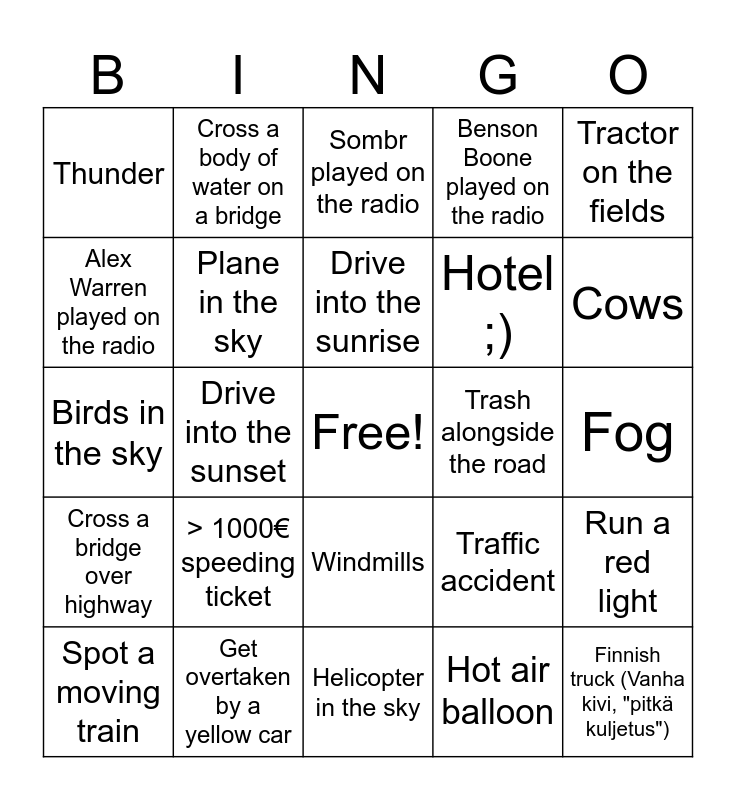 This bingo card has a free space and 48 words: Construction crane, Get overtaken by a yellow car, Caravan / mobile home trailer, Sunflowers, Cows, Green water, Cross a body of water on a bridge, Use a ferry, Trash alongside the road, Overtake a yellow truck, Alex Warren played on the radio, Plane in the sky, Helicopter truck, Run a red light, Haybales, Tractor truck, Sombr played on the radio, Traffic accident, Construction site, Thunder, > 1000€ speeding ticket, Helicopter in the sky, Benson Boone played on the radio, Tractor on the fields, Drive in a roundabout with traffic lights, Drive into the sunset, Drive into the sunrise, Fill up tank with >1000€, Fog, Cross a bridge over highway, >100€ toll cost, Cross "blue" border customs/toll, Drive through a tunnel in a mountain, Resetting graphics because of traffic, Spot a moving train, Drive across a railway, Pay >1200€ for gas in one go, Hot air balloon, Finnish truck (Vanha kivi, "pitkä kuljetus"), Use parking brake to stop a collision, Company drivers making >10k€ in one go, Windmills, Hotel ;), Fancy Villa / Castle, Birds in the sky, Bicycle, Field of wheat and Two police officers.