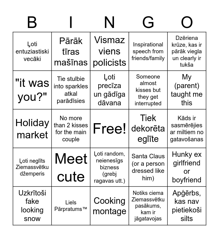 This bingo card has a free space and 24 words: Uzkrītoši fake looking snow, Meet cute, Ļoti precīza un gādīga dāvana, Notiks ciema Ziemassvētku pasākums, kam ir jāgatavojas, Dzēriena krūze, kas ir pārāk viegla un clearly ir tukša, Ļoti entuziastiski vecāki, Pārāk tīras mašīnas, Vismaz viens policists, Tiek dekorēta eglīte, Kāds ir sasmērējies ar miltiem no gatavošanas, Holiday market, Tie stulbie into sparkles atkal parādīsies, Santa Claus (or a person dressed like him), Hunky ex girlfriend or boyfriend, "it was you?", Liels Pārpratums™, Cooking montage, Inspirational speech from friends/family, My (parent) taught me this, Ļoti neglīts Ziemassvētku džemperis, No more than 2 kisses for the main couple, Ļoti random, neienesīgs bizness (grebj ragavas utt.), Someone almost kisses but they get interrupted and Apģērbs, kas nav pietiekoši silts.