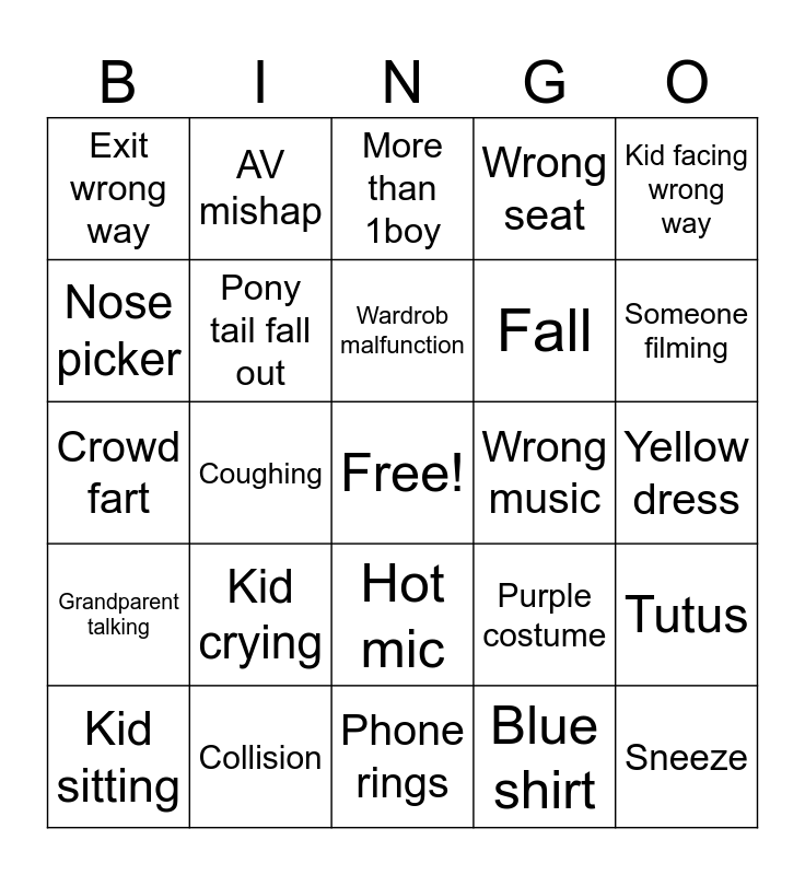 This bingo card has a free space and 24 words: Kid crying, Collision, Wardrob malfunction, Kid sitting, Kid facing wrong way, Exit wrong way, Nose picker, AV mishap, Wrong music, Hot mic, Fall, Crowd fart, Purple costume, Tutus, Pony tail fall out, Blue shirt, Yellow dress, More than 1boy, Someone filming, Coughing, Sneeze, Grandparent talking, Wrong seat and Phone rings.