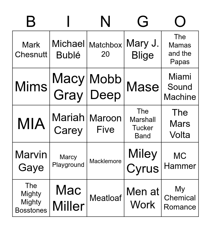 This bingo card has 41 words: Madonna, MIA, MGK feat Blackbear, Macy Gray, Mac Miller, Macklemore, Mobb Deep, Method Man, The Mamas and the Papas, Marvin Gaye, Mariah Carey, Mary J. Blige, Maroon Five, The Mars Volta, The Marshall Tucker Band, Marcy Playground, Milli Vanilli, Mark Chesnutt, Mastodon, Matchbox 20, MC Hammer, My Chemical Romance, Meatloaf, Mase, Megadeth, Meghan Trainor, Men at Work, MGMT, Miami Sound Machine, Michael Jackson, Michael Bolton, Michael Bublé, The Mighty Mighty Bosstones, Millencolin, Miley Cyrus, Mims, Minor Threat, Mindless Self Indulgence, Muse, Miranda Lambert and Michelle Branch.
