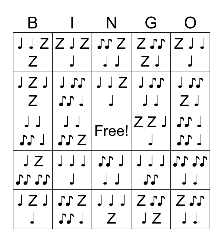 This bingo card has a free space and 25 words: ♩ ♩ ♩ ♩, ♩ ♩ ♩ Z, ♩ ♩ Z ♩, ♩ Z ♩ ♩, Z ♩ ♩ ♩, ♩ ♩ Z Z, ♩ Z ♩ Z, Z ♩ Z ♩, Z Z ♩ ♩, ♪♪ ♩ ♩ ♩, ♩ ♪♪ ♩ ♩, ♩ ♩ ♪♪ ♩, ♩ ♩ ♩ ♪♪, ♪♪ ♪♪ ♩ ♩, ♩ ♪♪ ♪♪ ♩, ♩ ♩ ♪♪ ♪♪, ♪♪ ♩ ♪♪ ♩, ♪♪ Z ♩ ♩, ♩ ♪♪ Z ♩, ♩ ♩ ♪♪ Z, Z ♪♪ ♩ ♩, ♪♪ Z ♪♪ ♩, ♩ Z ♪♪ ♪♪, Z ♪♪ Z ♩ and Z ♪♪ ♩ Z.
