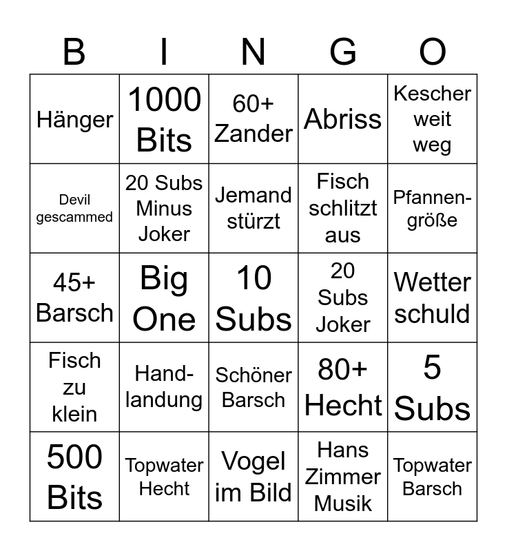 This bingo card has a free space and 24 words: Hand-landung, Topwater Hecht, Jemand stürzt, 500 Bits, Kescher weit weg, Hänger, Devil gescammed, 1000 Bits, 20 Subs Joker, Schöner Barsch, Fisch schlitzt aus, 45+ Barsch, 80+ Hecht, 5 Subs, 20 Subs Minus Joker, Hans Zimmer Musik, Wetter schuld, 60+ Zander, Pfannen-größe, Big One, Topwater Barsch, Fisch zu klein, Abriss and Vogel im Bild.